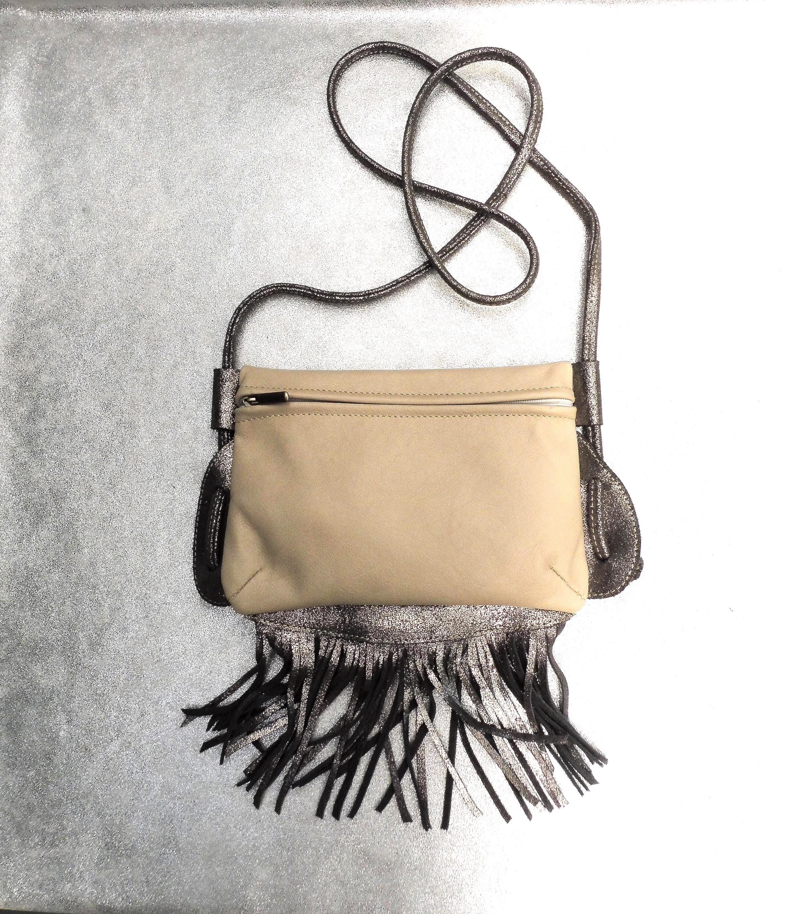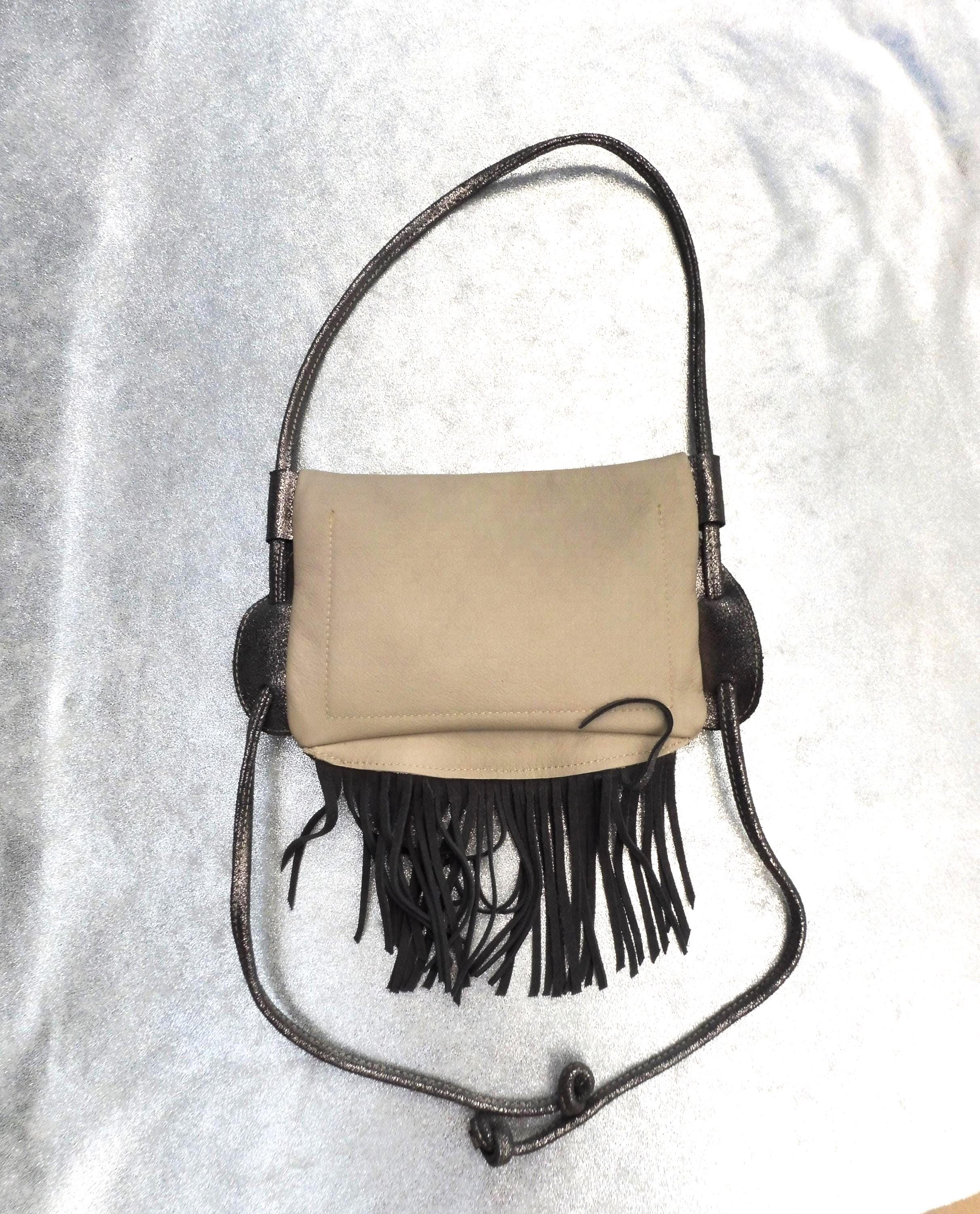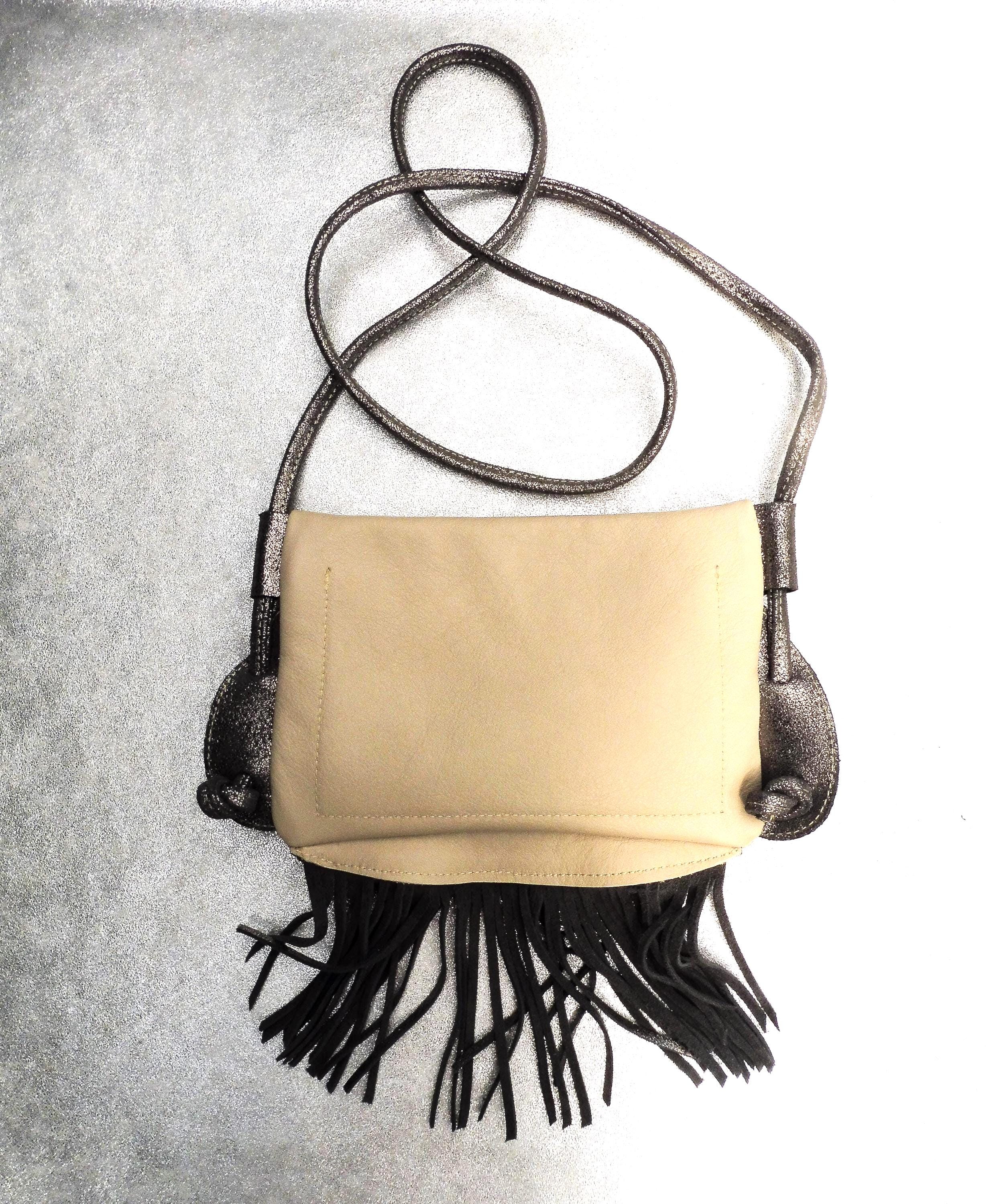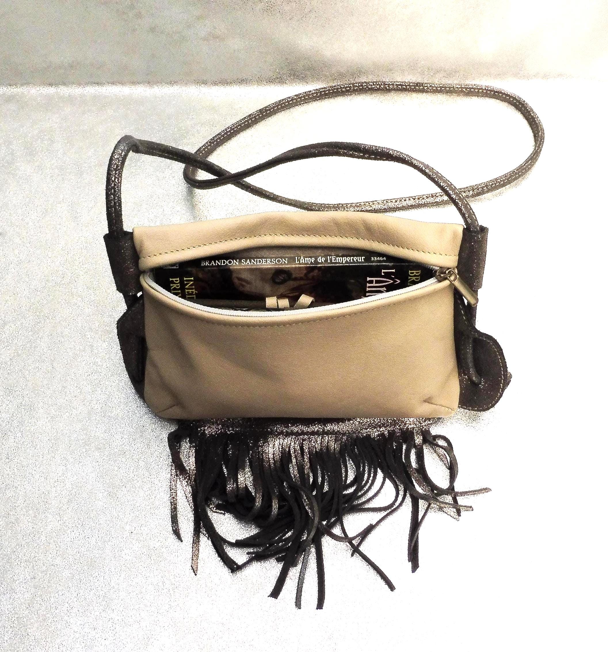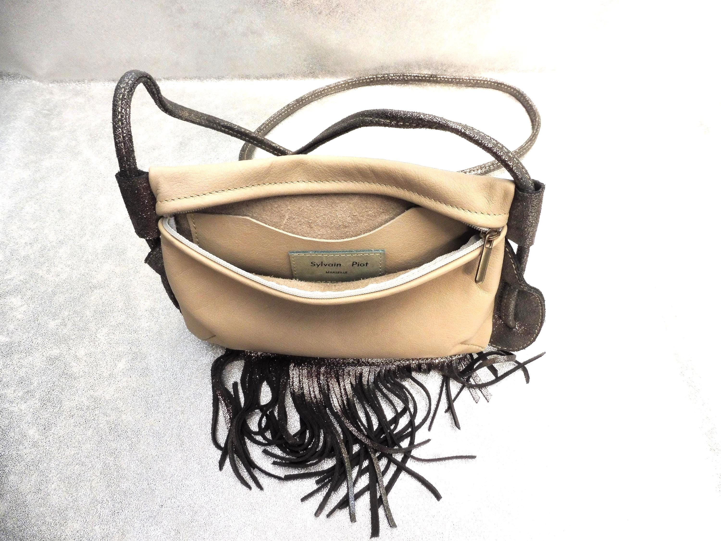 Small clutch bag in genuine ivory calfskin, with a silver calfskin strap and fringe. Usable dimensions: 21cm/14cm Shoulder strap length 140cm, adjustable by tying 1 interior patch pocket in matching leather Contents: wallet, glasses case, tobacco pouch, paperback book, etc. Other colors available upon request Created and manufactured in our workshop Unique piece, ideal for outings, walks...