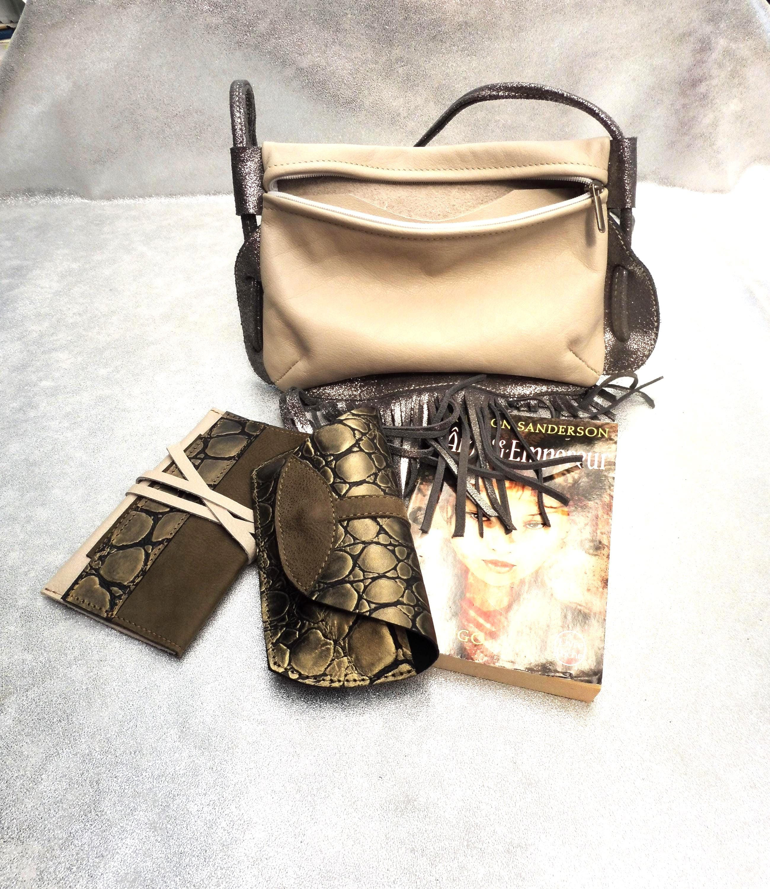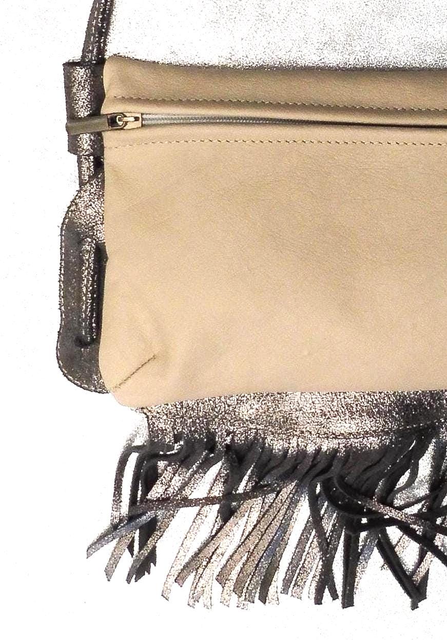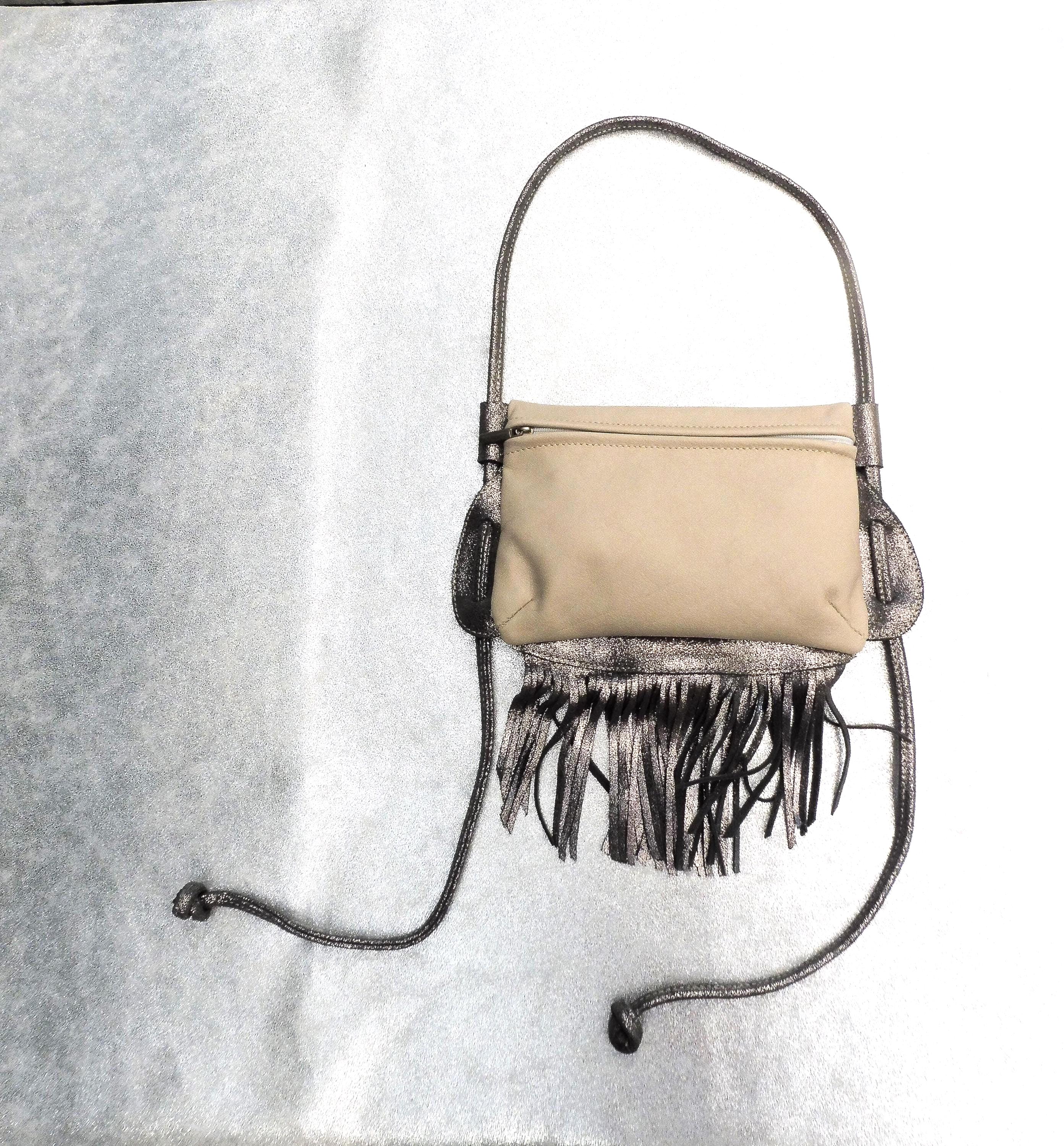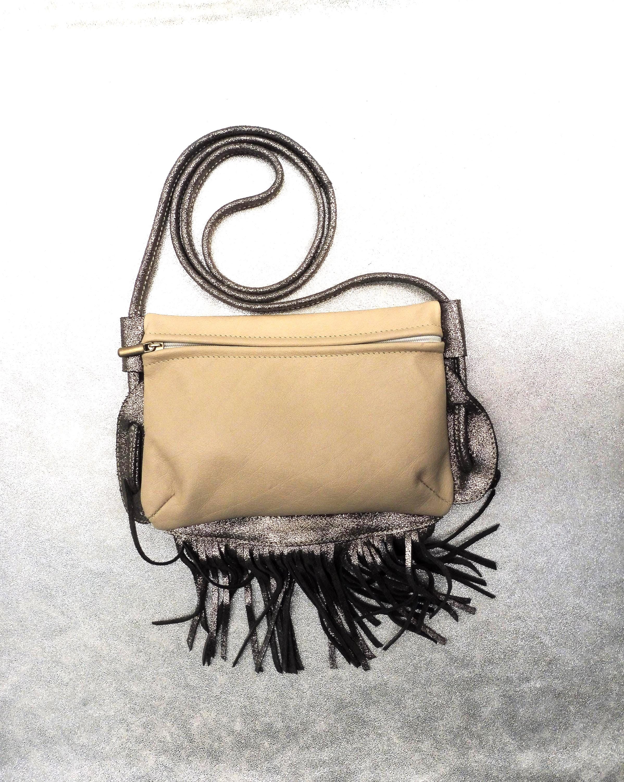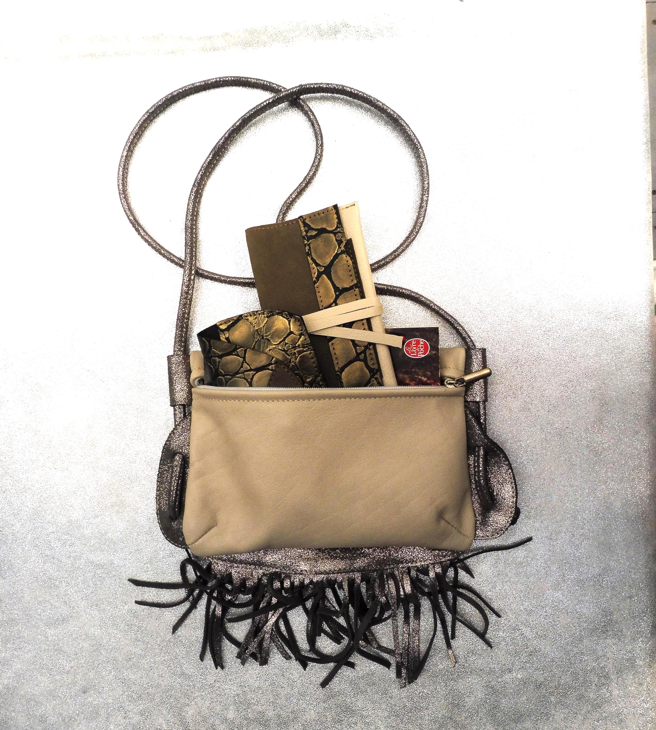 Small clutch bag in genuine ivory calfskin, with a silver calfskin strap and fringe. Usable dimensions: 21cm/14cm Shoulder strap length 140cm, adjustable by tying 1 interior patch pocket in matching leather Contents: wallet, glasses case, tobacco pouch, paperback book, etc. Other colors available upon request Created and manufactured in our workshop Unique piece, ideal for outings, walks...